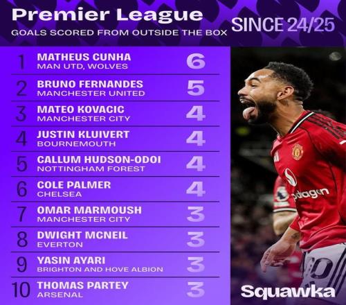 北京时间10月26日,知名数据平台Squawka列出了自上赛季以来,在英超联赛中禁区外进球最多的球员。库尼亚6球领跑榜单,B费5球位居第二,科瓦契奇4球第三。