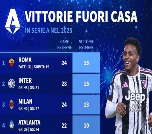 意甲球队2025年客场成绩:罗马、国米15胜第1,尤文21战仅8胜